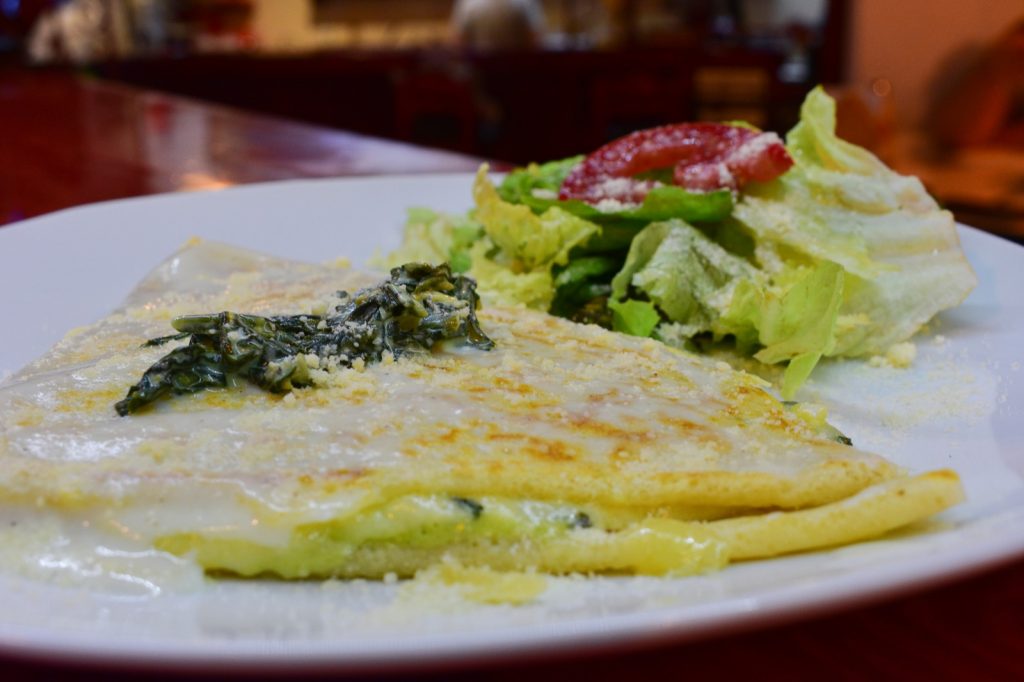 Pollo con chile poblano, granos de elote y crema en una cama de queso manchego, decorada con un toque de salsa bechamel y queso parmesano, acompañada con una guarnición de lechuga, jitomate, queso parmesano y aderezo italiano de la casa