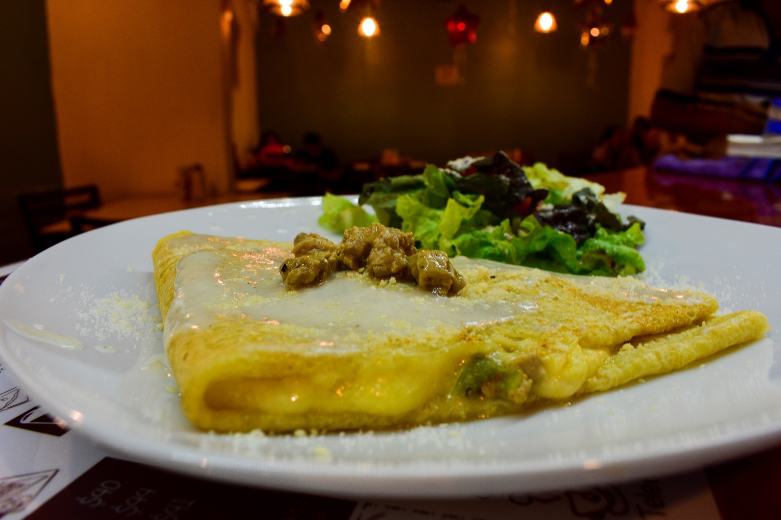 Bacalao a la vizcaína en una cama de queso manchego, decorada con aceitunas, pimiento y un poco mas de bacalao. ( Crepa de temporada / Diciembre)