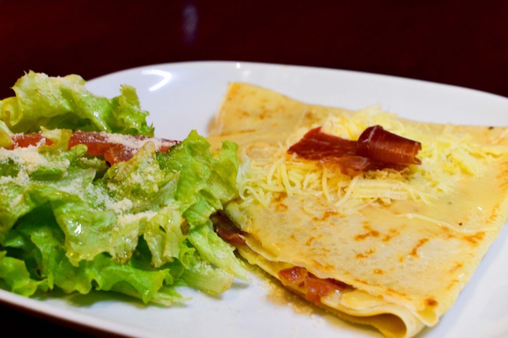 Jamón en una cama de queso manchego, decorado con queso manchego, acompañada con una guarnición de lechuga, jitomate y aderezo italiano de la casa