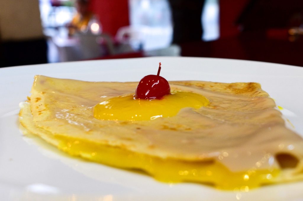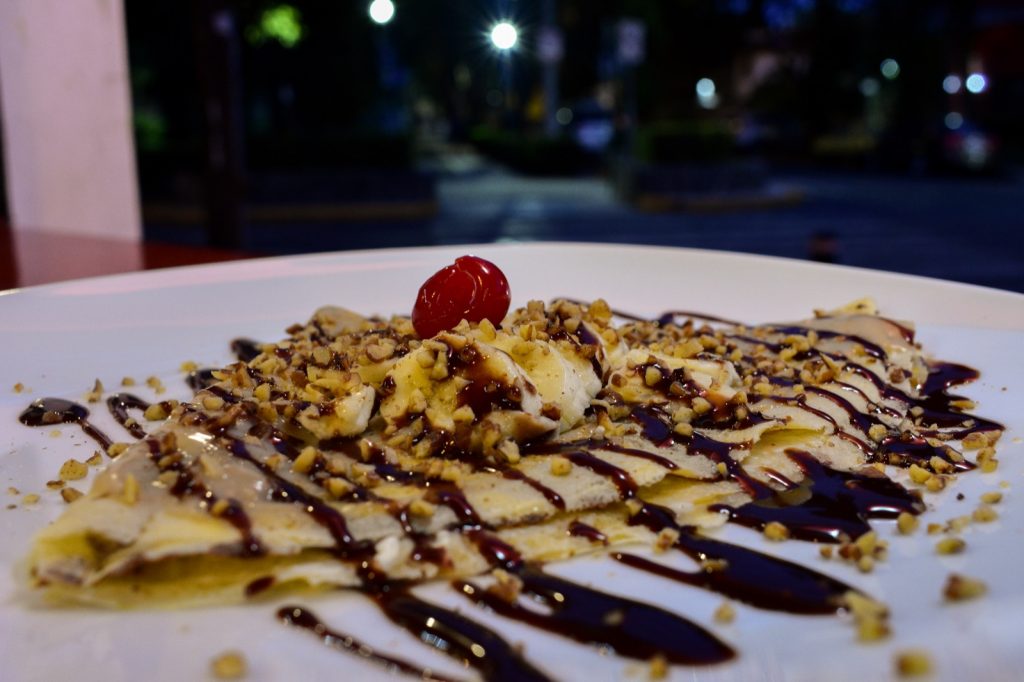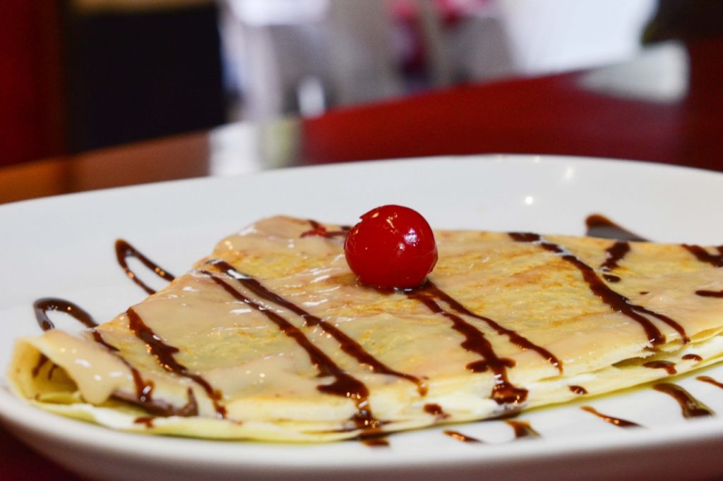 Crepa de chocolate rellena con hershey’s y queso crema, decorada con un toque salsa dulce inglesa y una cereza.