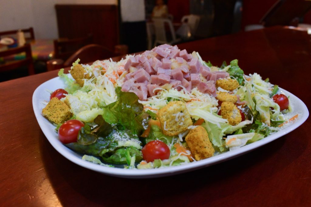 Jamón en una cama de queso crema, decorada con queso parmesano y acompañada con una grarnición de lechuga, jitomate y aderzo italiano de la casa
